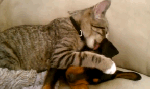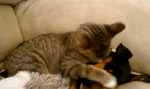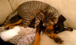 Zeke just got home from the vet — being allergic to certain grasses, he broke out in hives and they gave him steroid and benadryl shots. This is Winston, loving and taking care of him”