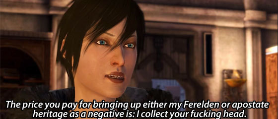Hawke: The price you pay for bringing up either my Ferelden or apostate heritage as a negative is: I collect your fucking head.