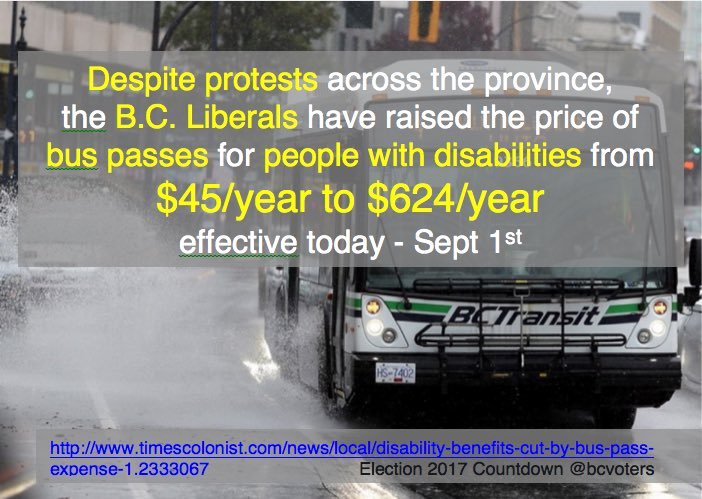 [Image description: A photo of a white and green BC Transit bus driving along a wet road on an overcast day, leaving a spray of water in its wake. White and yellow font overlaid reads “Despite protests across the province, the B.C. Liberals have raised the price of bus passes for people with disabilities from $45/year to $624/year effective today- Sept 1st”. End of image description.]